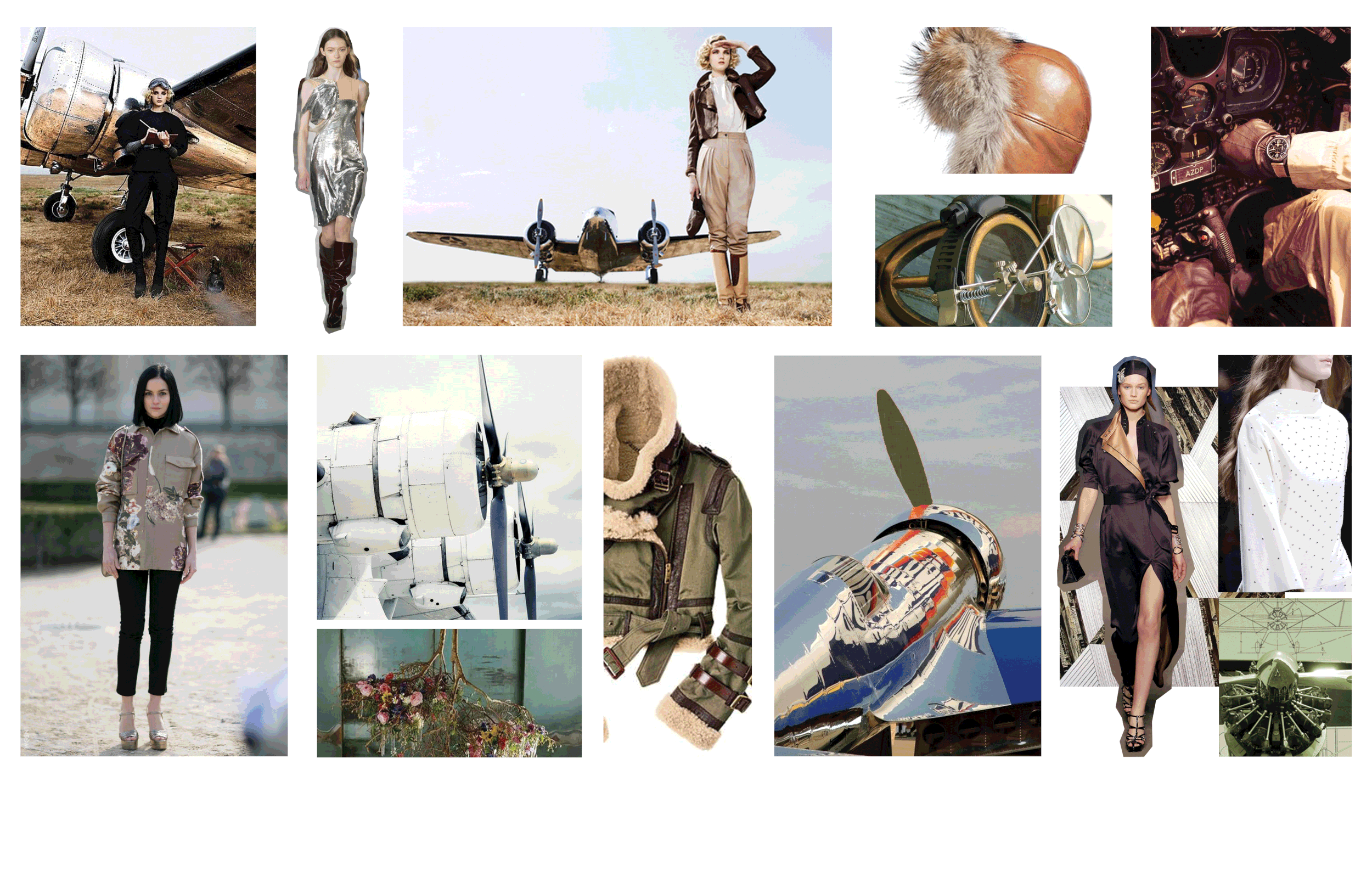 A spring collection conceptualized by the juxtaposition and push and pull of 1920’s aviation and the femininity of the spring bloom. Looking closely at not only utilitarian apparel but riveting of aircraft fuselage and the detail of cockpit controls. Collection of work consisting of concept, color, fabric, key looks and flat sketches below. Please hover over white arrow in grey box & scroll to right to view collection