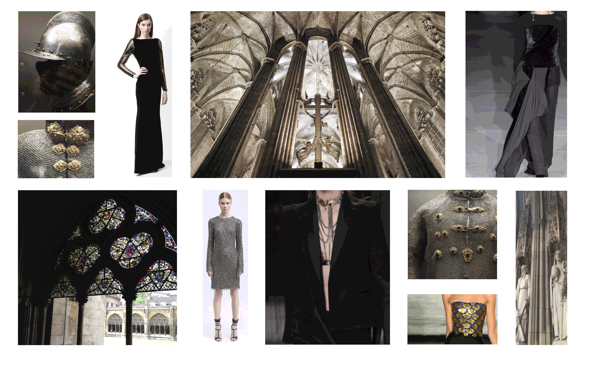 A Holiday collection inspired by the moody environment of cathedrals in the medieval times and knights in armor chainmail. Giving a nod to the grand and dark feeling of the cathedrals through velvet, fringe, and the color combination of black and navy. Looking towards the rich blend of silver and gold metal work truly working together and the draping used on the saints & spiritual characters with in the architecture. A collection of work consisting of concept, color, fabric, key looks and detail flats. Please hover over white arrow in grey box & scroll to right to view collection